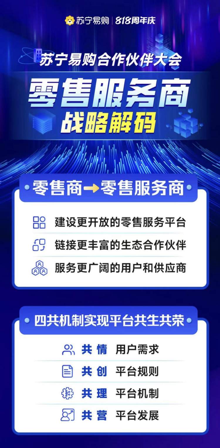 在战略定位上,苏宁易购加速从零售商升级为零售服务商,即服务型的零售商。这既是升级,也是回归,回归服务初心。苏宁易购将搭建更加开放的零售服务平台,链接更丰富的生态合作伙伴,服务更广阔的用户和供应商。