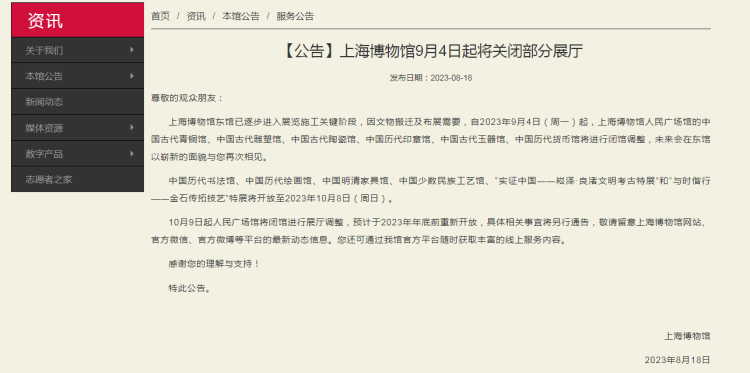 公告同时表示,上海博物馆人民广场馆的中国历代书法馆、中国历代绘画馆、中国明清家具馆、中国少数民族工艺馆、“实证中国——崧泽·良渚文明考古特展”和“与时偕行——金石传拓技艺”特展将开放至10月8日。10月9日起,人民广场馆将闭馆进行展厅调整,预计于2023年年底前重新开放,具体相关事宜将另行通告。