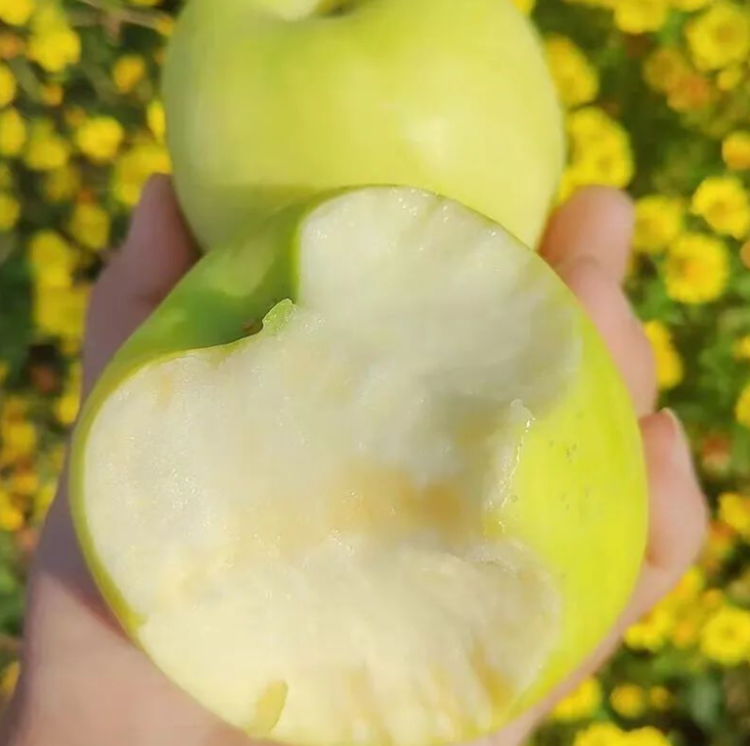 绿色的瑞雪苹果,果实形状圆润,果肉肥厚比较结实,表皮有偏黄色和偏绿色的,色泽清雅,果肉呈黄色。