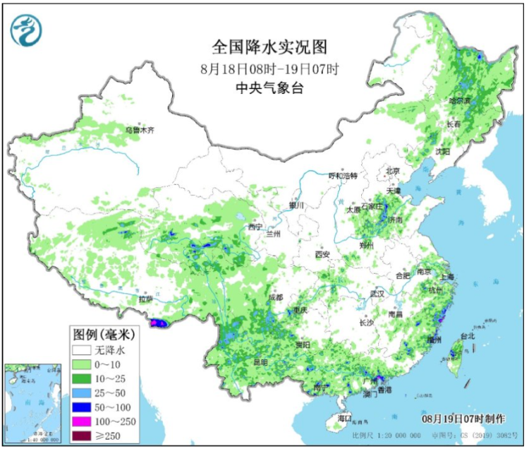 过去一天,全国降雨分散,河北南部、河南北部、山东西部、黑龙江中部、吉林北部、辽宁中部等地部分地区出现大雨或暴雨,河北邢台、河南安阳和新乡局地大暴雨;江苏东南部、上海、浙江、福建北部和东部、广东中西部、广西、贵州西部、云南、四川南部、重庆南部、湖北西部等地出现分散性大到暴雨,浙江温州,福建宁德、福州、莆田,广东深圳、广州等局地大暴雨。