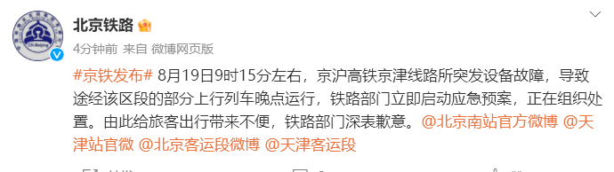 出行小灵通丨京沪高铁京津线路所突发设备故障,部分列车晚点 周到君 2023-8-19 来源:周到上海 今日,周到君从@北京铁路 获悉,8月19日9时15分左右,京沪高铁京津线路所突发设备故障,导致途经该区段的部分上行列车晚点运行,铁路部门立即启动应急预案,正在组织处置。由此给旅客出行带来不便,铁路部门深表歉意。 来源:周到上海 作者:周到君 赞一个 (0)