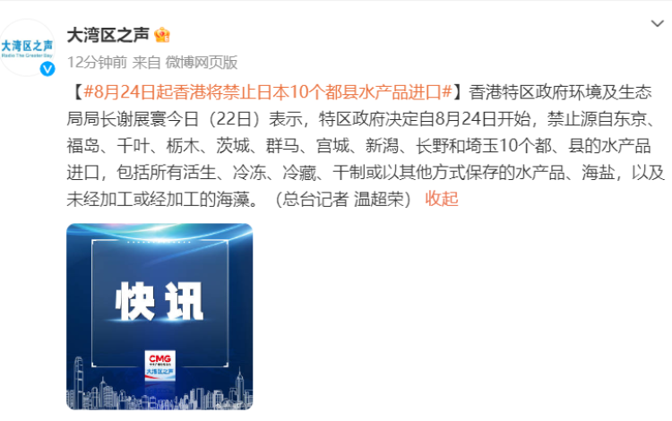 神州播报丨香港:8月24日起将禁止日本10个都县水产品进口 周到君 2023-8-22 来源:周到上海 @大湾区之声 消息,香港特区政府环境及生态局局长谢展寰今日(8月22日)表示,特区政府决定自8月24日开始,禁止源自东京、福岛、千叶、栃木、茨城、群马、宫城、新潟、长野和埼玉10个都、县的水产品进口,包括所有活生、冷冻、冷藏、干制或以其他方式保存的水产品、海盐,以及未经加工或经加工的海藻。 来源:周到上海 作者:周到君 赞一个 (0)