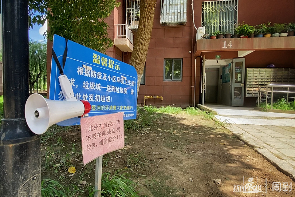 当天下午2点,记者在14号楼下并未看到有垃圾堆放。在楼下这块绿化带的空地上,同样竖着一块标牌,写着“垃圾请统一送到垃圾房,请勿在此乱扔垃圾”。同时,标牌上还挂着一个喇叭,不间断地在播放“请勿在此乱扔垃圾”。