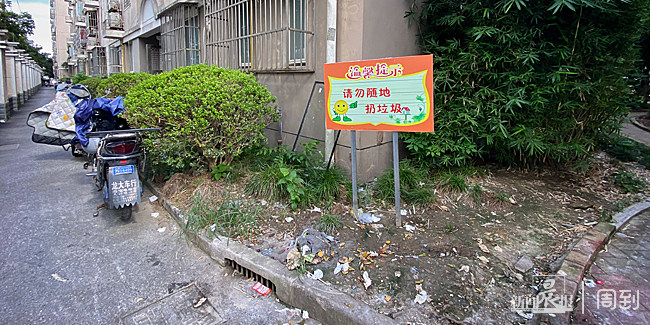 讽刺的是,这块绿化带上还竖立着一块宣传牌,上面写着“请勿随地扔垃圾”。记者实地测量了一下,从这块绿化带走到小区固定的垃圾投放点,仅花了两分钟不到的时间,距离不过一两百米。
