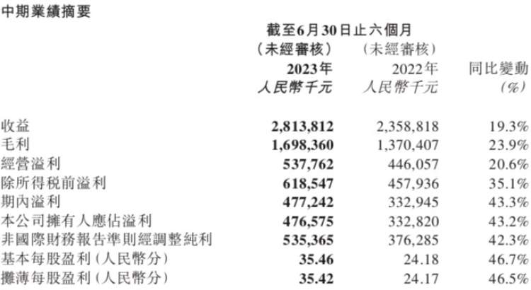8月22日,泡泡玛特发布的2023中期业绩显示,上半年实现营收28.14亿元(人民币,下同),同比增速19.3%;经调整净利润5.23亿元,同比增长42.3%,其中净利润4.77亿元,超去年全年净利润;上半年毛利率60.4%,同比提升2.3个百分点;经调整利润率19%,同比提升3个百分点。