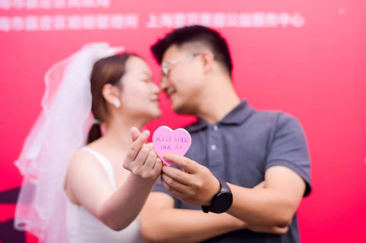 95年的刘小姐与先生共同朗诵了《致橡树》,并让摄像师留下了读诗一刻。“看到嘉定婚登七夕预告后,就决定在七夕来这里参与这个活动,我们本身也是诗词爱好者。而且我们也希望领证的这个美好过程,能够‘诗情画意’,后面我们的婚礼上也会播放读诗的这些精彩片段。非常有纪念意义!”