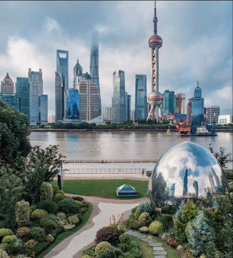小巨蛋下是精心打理的花镜,小巨蛋上是蓝天和白云的投影,背后则是经典的外滩四件套,是不少人眼中的“神仙机位”。