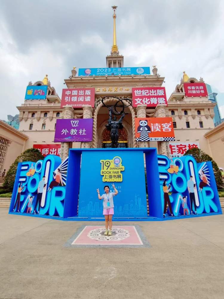朱茜在上海展览中心书展主标志背景墙前拍照留念
