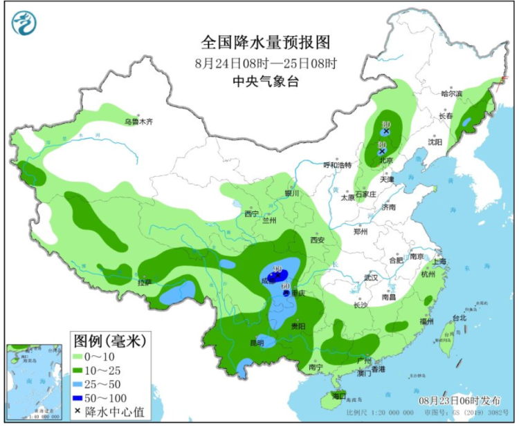 8月24日08时至25日08时,内蒙古东南部、河北北部、北京中北部、西藏北部和东部、西南地区大部、广西中北部、广东北部、海南岛北部等地的部分地区有中到大雨,其中,四川盆地中南部等地局地有暴雨(50~90毫米)。内蒙古中西部、辽东半岛、山东半岛等地的部分地区有4~6级风(见图2)。