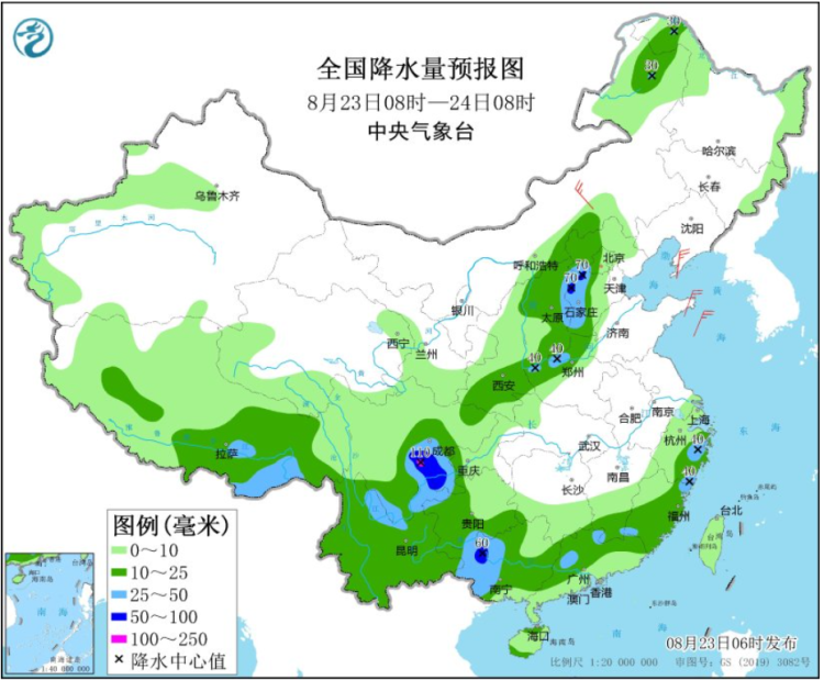预计,8月23日至26日,四川盆地、陕西南部等地有大到暴雨,部分地区有大暴雨。此外,23日08时至24日08时,内蒙古东北部、黑龙江西北部、河北中西部、北京西部、山西、河南西北部、陕西南部、四川盆地中西部、云南、贵州西部和南部、江南东部和南部、华南大部等地部分地区有中到大雨,局地有暴雨。上述部分地区伴有短时强降水(最大小时降雨量20~40毫米,局地可超过50毫米),陕西南部、山西东部和南部、河北西部、河南北部和西部、四川东北部等地的局地有雷暴大风或冰雹天气。