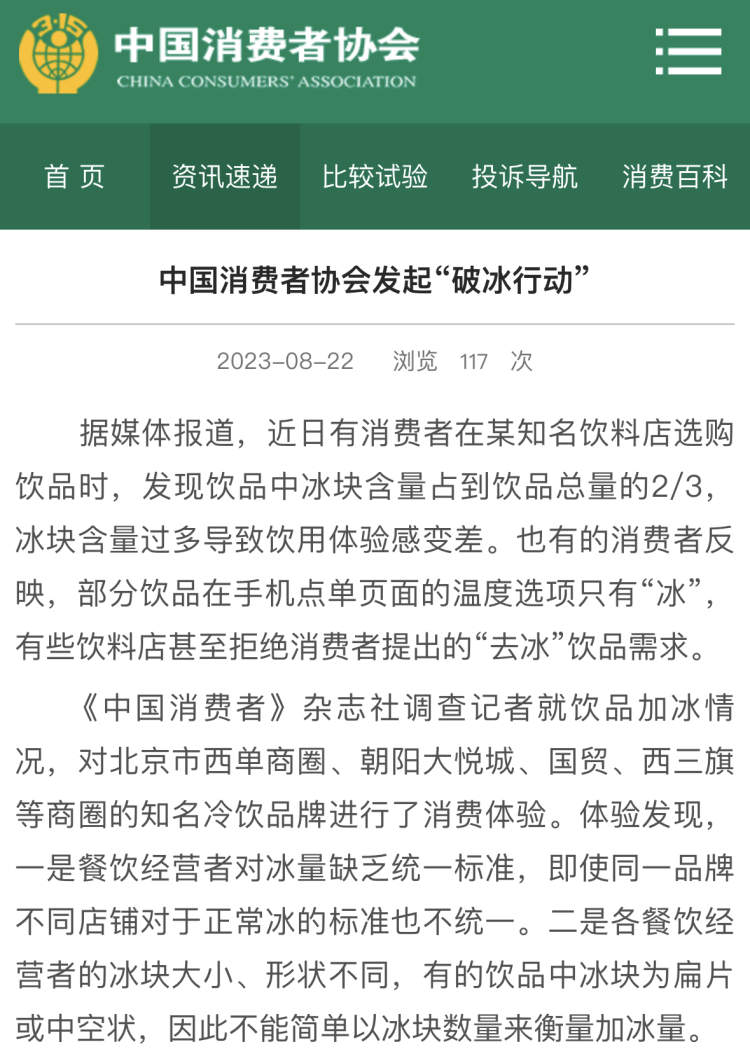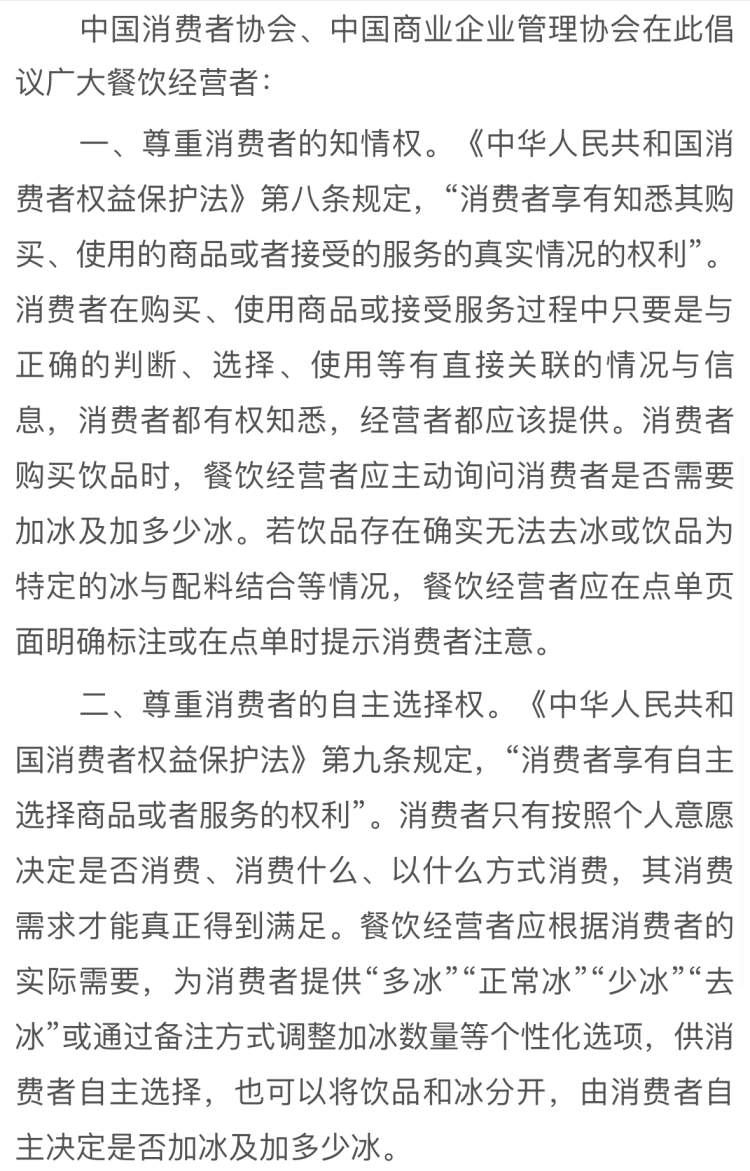 据中国消费者协会网站8月22日消息,中国消费者协会、中国商业企业管理协会发出倡议。倡议中强调,饮品加冰需以尊重消费者合法权益为前提。