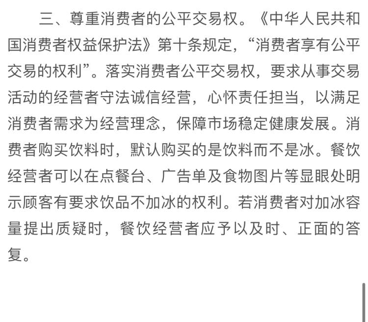 《中华人民共和国消费者权益保护法》第十条规定,“消费者享有公平交易的权利”。落实消费者公平交易权,要求从事交易活动的经营者守法诚信经营,心怀责任担当,以满足消费者需求为经营理念,保障市场稳定健康发展。消费者购买饮料时,默认购买的是饮料而不是冰。餐饮经营者可以在点餐台、广告单及食物图片等显眼处明示顾客有要求饮品不加冰的权利。若消费者对加冰容量提出质疑时,餐饮经营者应予以及时、正面的答复。