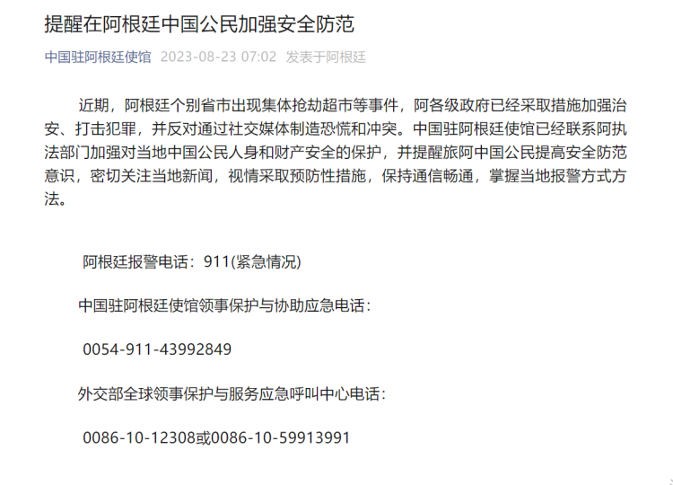8月23日,中国驻阿根廷大使馆发布安全提醒。 提醒表示,近期,阿根廷个别省市出现集体抢劫超市等事件,阿各级政府已经采取措施加强治安、打击犯罪,并反对通过社交媒体制造恐慌和冲突。中国驻阿根廷使馆已经联系阿执法部门加强对当地中国公民人身和财产安全的保护,并提醒旅阿中国公民提高安全防范意识,密切关注当地新闻,视情采取预防性措施,保持通信畅通,掌握当地报警方式方法。