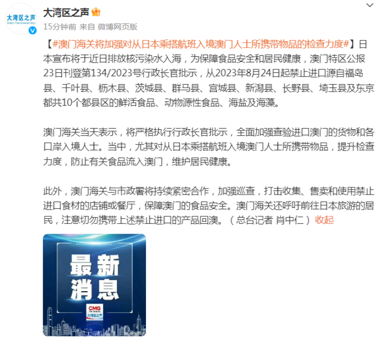 早前,澳门特区政府已宣布,从8月24日起禁止进口源自日本福岛县、千叶县、枥木县、茨城县、群马县、宫城县、新潟县、长野县、埼玉县及东京都共10个都县区的鲜活食品、动物源性食品、海盐及海藻,包括蔬菜、水果、奶及奶制品、水产及水产制品、肉类及其制品、禽蛋等。