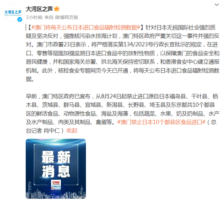 据@大湾区之声 针对日本无视国际社会强烈质疑及坚决反对,强推核污染水排海计划,澳门特区政府严重关切这一事件并强烈反对。澳门市政署23日表示,将严格落实第134/2023号行政长官批示的规定,在进口、零售等层面加强监测日本进口食品中的放射性物质,以保障澳门的食品安全和居民健康,并和国家海关总署、拱北海关保持密切联系,和香港食安中心建立通报机制。此外,核检食安专题网页今天(8月23日)已开通,将每天公布日本进口食品辐射检测数据。