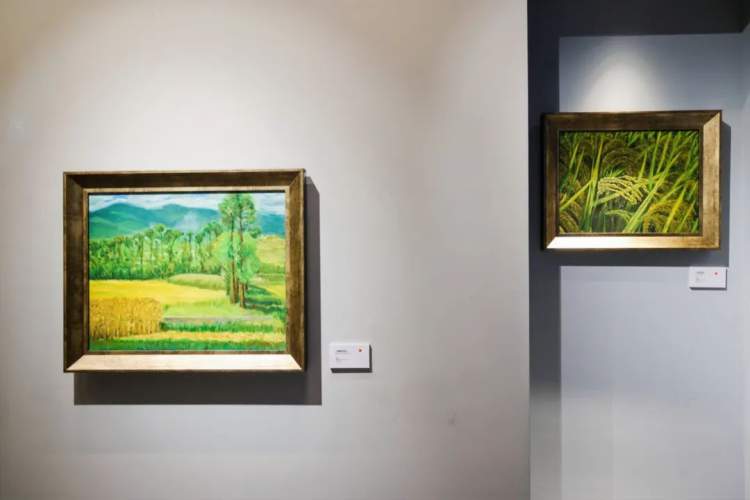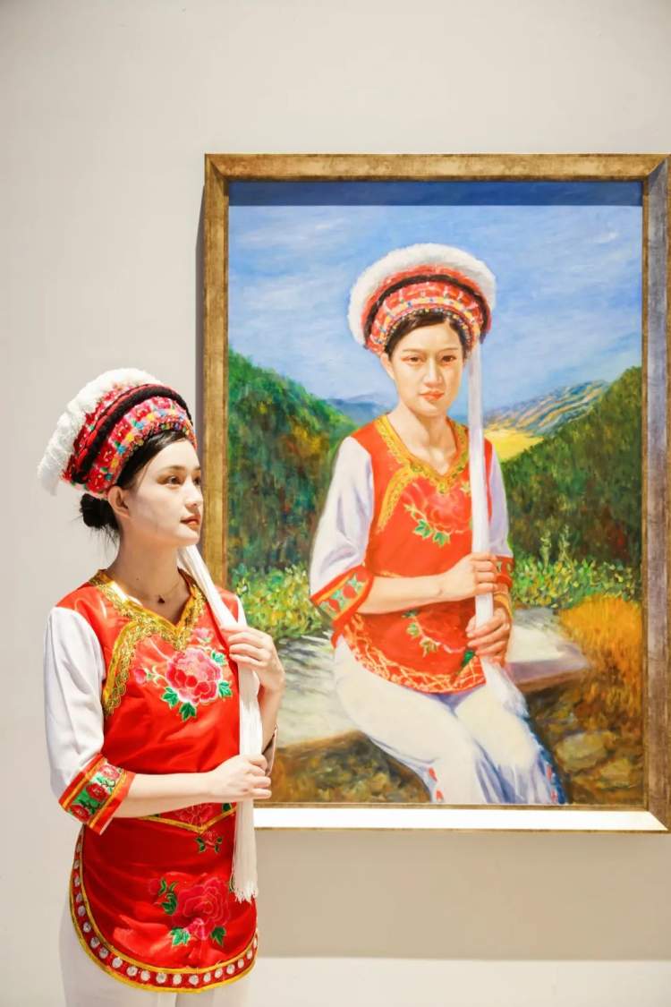 画展重量级作品《阿紫香》描绘了凤羽土生土长的白族少女阿紫香。她穿着白族的传统服装,手里拿着象征少女身份的长帽穗。黄昏的光线照亮了她的脸庞,并渲染开来,蔓延到石阶、稻田和山脊之上。少女的目光宁静,与周围的景色共同营造出一种美好而恬静的氛围。画作中的阿紫香本人也再次身着画中白族传统服饰来到现场支持画家,她说人生中第一次入画打开了自己看世界的眼睛,也开启了从乡村姑娘到珠宝创作者的艺术生命之路。