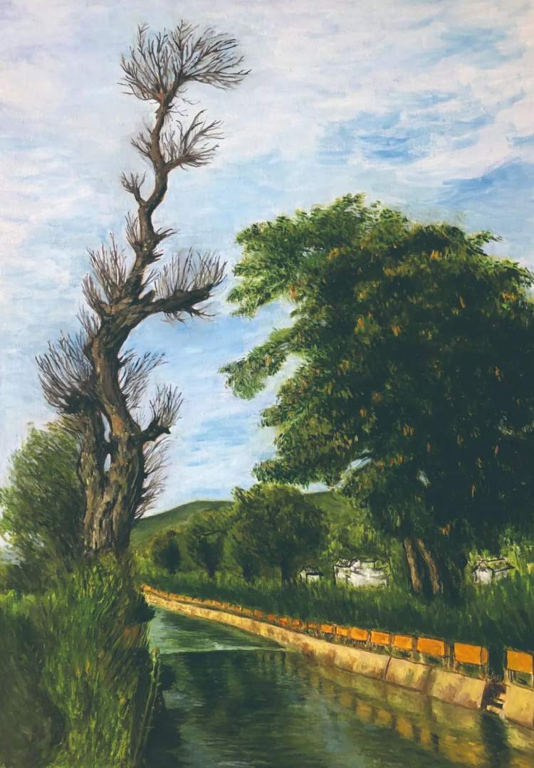 58岁的姜军前一年才刚拿起画笔,就受封新城之邀进入了凤羽驻坝创作,创立了与19世纪法国“巴比松画派”画派隔空遥应的“凤羽画派”,三年间创作了逾40幅作品。