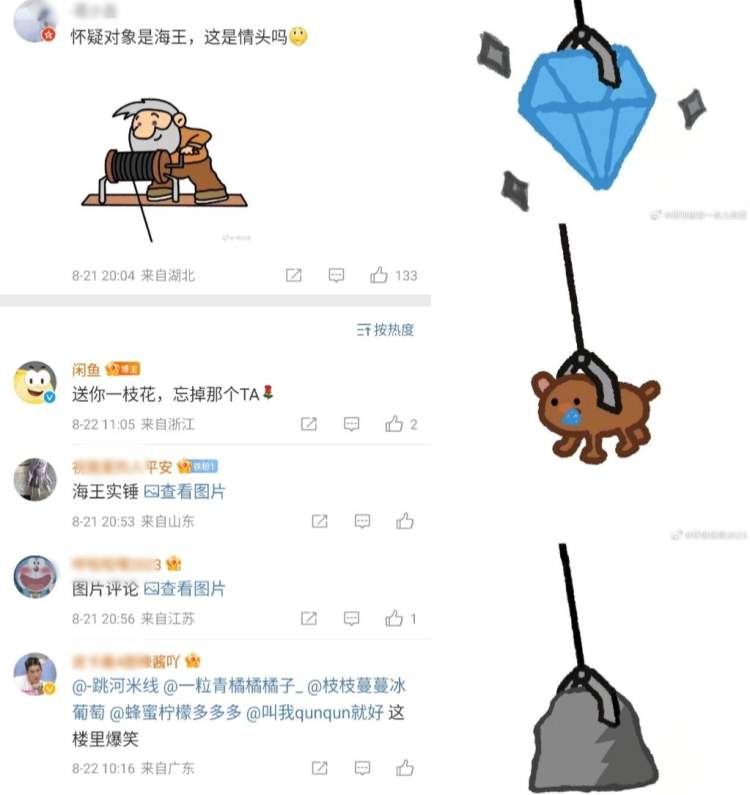 闲鱼这条微博之所以能如此火爆,除了这种“严谨的礼貌”戳中了网友的痛点,脑洞大开、花样百出的评论区才是网友们自愿充当自来水的关键。一场情侣头像鉴别大赛,慢慢演化成“图片组cp”大赛。看似毫无关联的图片,被网友捕捉到可以关联的元素与情节,还有让网友会心一笑的网络热梗,氛围完美适配的剧照和自拍,各种邪门的cp感在评论区蔓延开来。