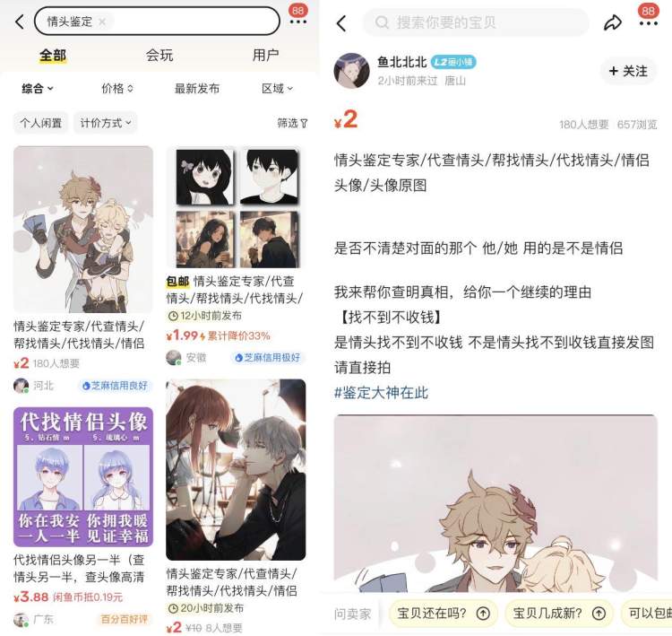 七夕前夕,闲鱼官方微博发布了一则“情头侦探事务所”的内容,引发网友热切讨论。一直以来,在闲鱼上存在着大量“情侣头像鉴定”的服务,不少人有了心动的对象后却拿不准能否告白,于是提前在闲鱼上求助广大5g冲浪的“情头侦探”,通过鉴定对方是否为情侣头像来判断对方是否是单身,从而决定是否要大胆出击。数据显示,近一周以来闲鱼上“情头鉴定“的搜索量暴涨378% ,单日最多有超过600人在闲鱼上求助该服务。