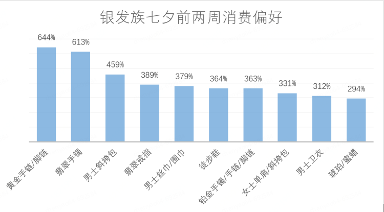 不同年龄的人群有着不同的生活观、爱情观,在七夕礼品的选择上也呈现出明显的差异。京东数据显示,银发族在这个七夕节前的消费非常活跃。他们在黄金手链、翡翠手镯、斜挎包等商品的消费偏好较高,银发族在七夕前购买男士丝巾/围巾、男士卫衣的消费占比高于全站,同时,银发族喜爱的徒步鞋、琥珀/蜜蜡等也在七夕节前畅销。
