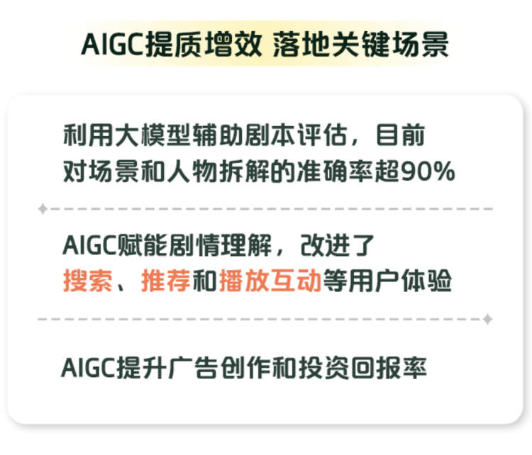 例如,利用大模型从剧本中提取核心信息,可辅助立项前期的剧本评估,实现更精确的预算规划和资源管理。数据显示,目前生成式AI对剧本场景和人物的拆解准确率超过90%。再比如,爱奇艺利用生成式AI 迅速实现对影视剧的剧情理解,并以此改进搜索、推荐和播放互动等方面的用户体验。