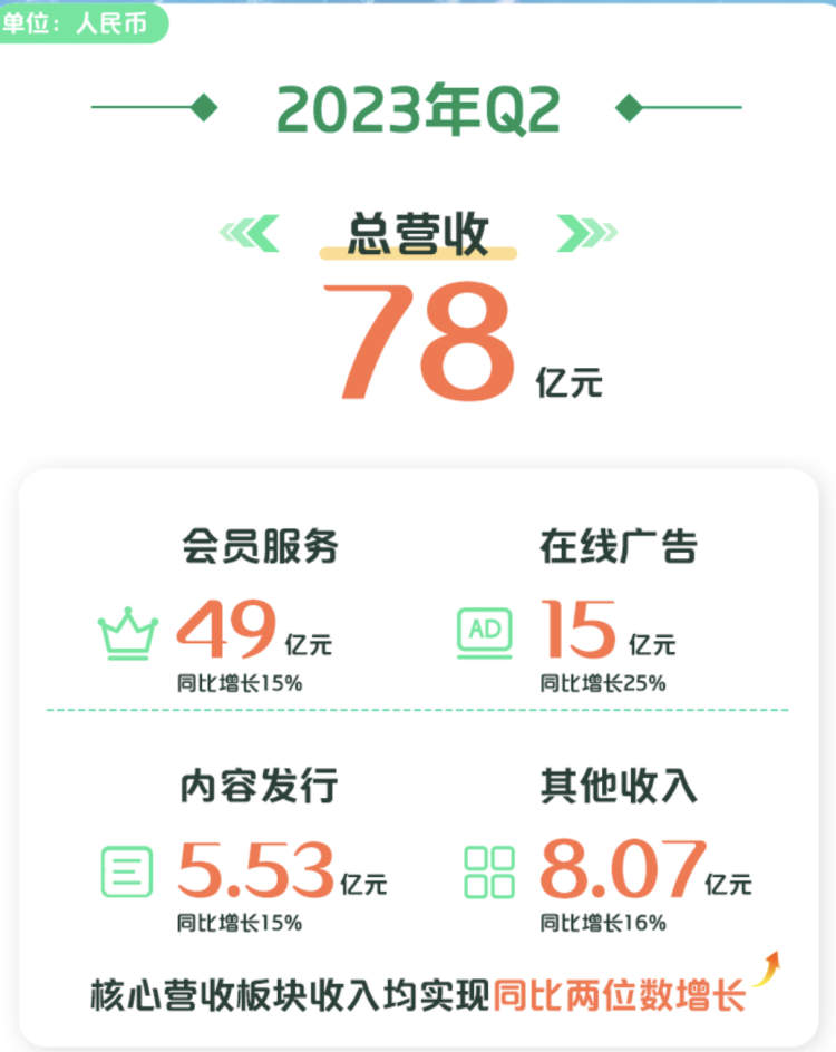 8月22日,爱奇艺(NASDAQ:IQ)发布的截至6月30日未经审计的第二季度财报显示:爱奇艺第二季度的总营收为78亿元人民币,同比增长17%。其中,会员服务营收49亿元,同比增长15%,当季爱奇艺日均订阅会员数1.11亿,较去年同期9830万增长13%。