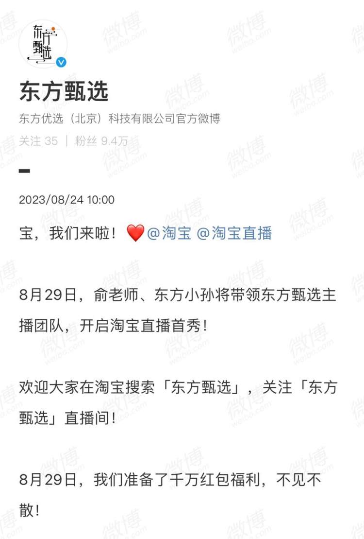 24日,东方甄选官宣确认,将在8月29日正式入淘开播,俞敏洪带队!继东方甄选官微发布预告后,淘宝官微霸气回应,欢迎东方甄选,并配图“更大的世界,更好的甄选”。
