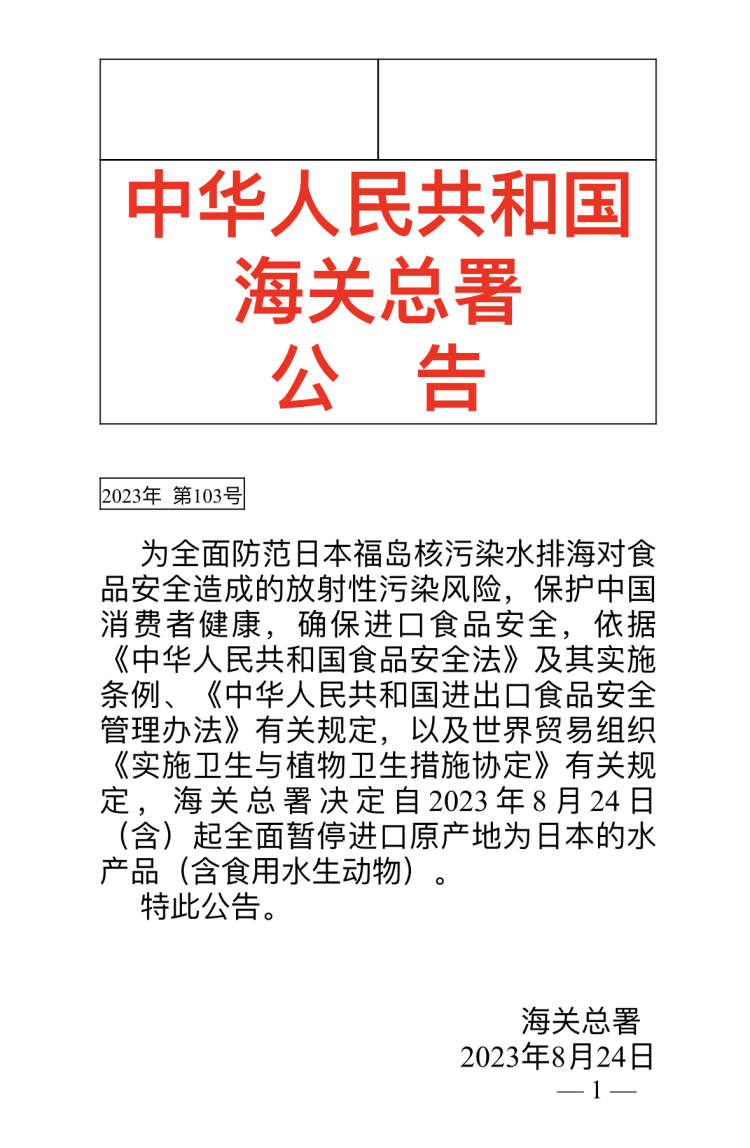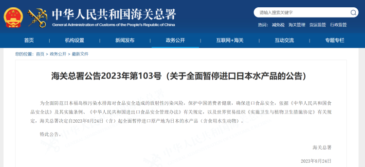 据海关总署网站消息,8月24日,中华人民共和国海关总署发布关于全面暂停进口日本水产品的公告。公告称,为全面防范日本福岛核污染水排海对食品安全造成的放射性污染风险,保护中国消费者健康,确保进口食品安全,依据《中华人民共和国食品安全法》及其实施条例、《中华人民共和国进出口食品安全管理办法》有关规定,以及世界贸易组织《实施卫生与植物卫生措施协定》有关规定,海关总署决定自2023年8月24日(含)起全面暂停进口原产地为日本的水产品(含食用水生动物)。