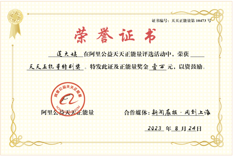 除此之外,银发心愿栏目组还协助阿姨申请了社会奖励。在得知到莲大姨凡人善举后,阿里巴巴“天天正能量”决定联合新闻晨报·周到上海,为莲大姨颁发一万元正能量特别奖。