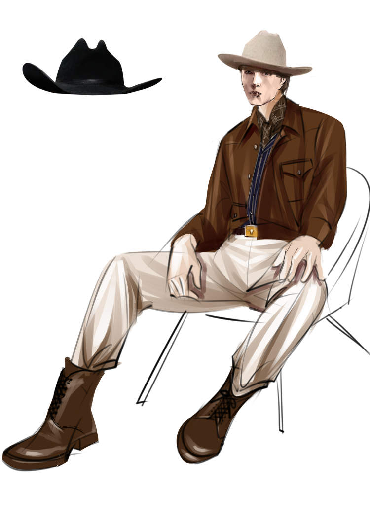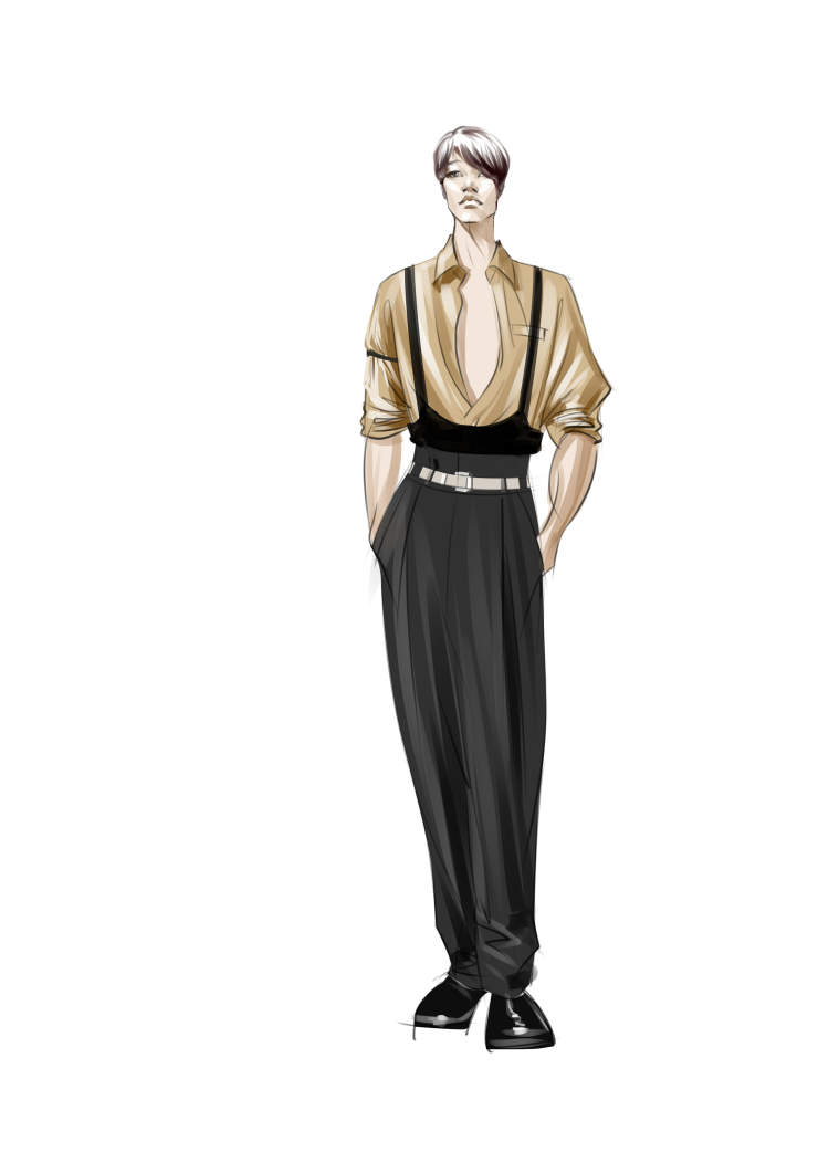 而在此基础上,设计师也需要考虑演奏者的很多实际需求,例如弹奏吉他时,由于乐器与身体的接触面很大,演奏者服装的胸前和袖口处就不适宜安装金属排扣或者复杂的装饰。盘绳的设计就缝制在了袖口外侧,避免与乐器形成剐蹭。鼓手在演奏时动作幅度更大,设计师专门把衬衫腋下部分的布料换成了弹性更大的材质,还配有假短裤固定,避免演出过程中衣服下摆上移、整体着装不平整的情况出现。