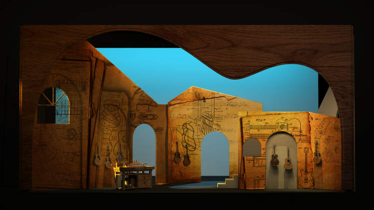 在舞台设计上,舞美团队搭建了西班牙建筑风格的小方窗和圆拱门装置,既强调了本剧中“门”这个重要的造型元素,同时左右的推移拉动,又可以结合灯光形成唯美的流动光影,展现庄严崇高的哥特教堂、斑斓温暖的彩色玻璃、熙熙攘攘的市井街道、浪漫柔情的街头小酒馆、安静温馨的制琴室等室内外不同场景。大片西班牙纹理墙面既是多媒体的创作载体,也是灯光晕染的承载。