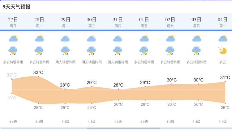 28~31日,受高空槽影响,本市有次较明显的降水过程,请大家小心防范。9月1日起多云到阴为主,“散装”降水再度“上线”。气温方面,本月底至下月初气温将明显下一台阶,白天最高气温回落至30℃以内,最低气温25℃附近。
