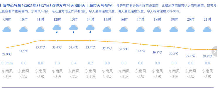 今天多云到阴有分散性阵雨或雷雨,北部雨量可达大雨到暴雨程度。今天早晨4时22分崇明区气象台已发布暴雨黄色预警信号。全天气温在27~32℃之间,东南风4~5级,相对湿度90%~50%。今天的雨分布不均,白天体感还是有些热,大家可备把晴雨伞在身边~