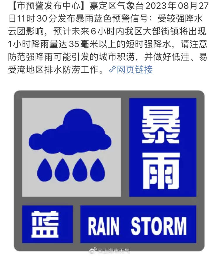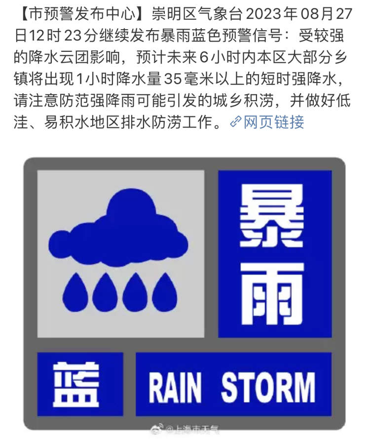 雷电黄色预警+暴雨蓝色预警!上海这些区域有短时强降水,注意防范 周到君 2023-8-27 来源:周到上海 上海中心气象台2023年08月27日12时20分发布雷电黄色预警信号: 预计今天午后到夜里,本市大部地区将发生雷电活动,可能会造成雷电灾害事故,并伴有小时雨强20-40毫米的短时强降水,请注意防范。 此外,宝山、嘉定、崇明等陆续发布暴雨蓝色预警⬇️ 来源:周到上海 作者:周到君 赞一个 (0)