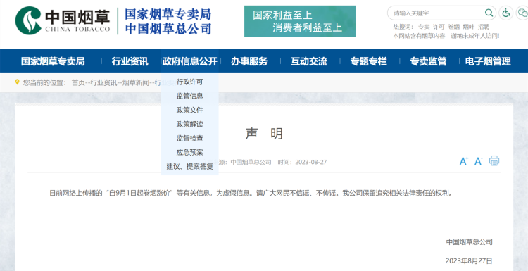自9月1日起卷烟涨价?中国烟草总公司辟谣! 周到君 2023-8-28 来源:周到上海 据中国烟草总公司网站消息,8月27日,中国烟草总公司针对“自9月1日起卷烟涨价”等有关信息发布辟谣声明。 声明称,日前网络上传播的“自9月1日起卷烟涨价”等有关信息,为虚假信息。请广大网民不信谣、不传谣。我公司保留追究相关法律责任的权利。 △截图自中国烟草总公司网站 来源:周到上海 作者:周到君 赞一个 (0)