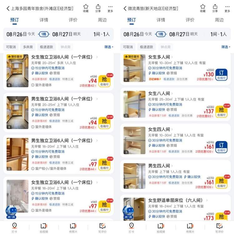 据了解,许多青旅的网络宣传也是吸引一批人体验的方式,对于经营者而言更顺应时代,除了大众点评好评以外,也趋向于入驻短视频平台做一些引流。工作人员说:“就论平台来讲,小红书上会有一些客人自主地去写,因为本身上海这个城市就很多元化,年轻人比较爱分享。所以我们的重心还是放在专门订房的一些APP上,比方说美团、携程。一般来说我们做的其实蛮好的,客人评价也是蛮高的,但是有的时候也会就做商家偶尔就肯定会遇到恶意差评。”目前居住在这里的,大多数顾客群体还是以学生为主。“因为学生之间会互相推荐,一些高校的特别多,比如附近的财经大学特别多,还有就是来上海实习的。主要且稳定的客源来源于两个:第一个是互相推荐介绍,第二个是一些学校的老师,包括教育培训、舞蹈机构等各类教培老师。”