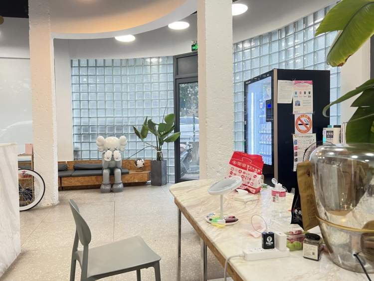 位于虹口足球场附近的“微流青旅”是一家胶囊式青旅,比起一般的青年旅舍,胶囊旅馆由于四面包围,私密性更好,且价格更低,作为一种高密度的居住形式,胶囊旅馆像是能住人的“蜂巢”。推开门走进一楼客厅,映入眼帘的是“现代风”十足的客厅,一块块透明磨砂玻璃组成的外墙,进门后就有一台让人难以忽略的自动售货机。右手边的沙发旁站立着一个“网红”大摆件;左手边一条长桌摆放在最显眼的位置,桌上堆着快递盒外卖盒、各种生活用品。放眼望去,一楼只有零星几个顾客,穿着休闲舒适的居家服,坐在客厅沙发或长桌旁独自玩着手机,互相之间交流甚少。