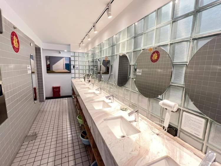 随着小编的到来,前台热情的招待我。来到二楼,公用的洗漱间,像是大学的宿舍,每一个洗手台下都摆放着五颜六色的洗漱盆,盆内放着个人用品。走到最深处,公用的洗手间和淋浴间,狭小且不通风。