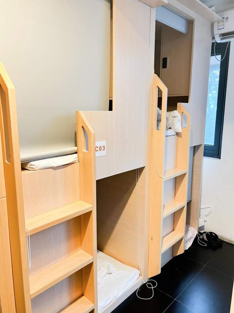 工作人员按下密码锁,一个女生从坐在门口最近的舱内起身,随即关上自己的舱门。工作人员对房间内的成员比较熟悉,“他们大多都是长住的,现在选择入住青旅的人,通常是为了减少开支、强调隐私,又或是因为无法支付得起押一付三,渴望压缩租房成本。我们这边房间会比较少,大概只有二十多个舱位,但是这种类型的反倒有很多人喜欢,毕竟现在大家都很注重个人隐私。”一个房间内六个胶囊舱排列在进门左手边,还算宽敞的过道尽头是晾衣服的地方,算不上是个阳台,只是有晾衣架和一扇通风的窗,对于住在这里的住客而言,只能满足最基本的生活需求。