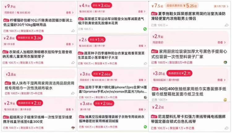 这个变化也淘宝上工厂直供的日用百货大店淘工厂则成了显眼包,很多“淘宝100W+”宝贝都是出自淘工厂:9.9元的猫砂,7.5元一双的踩屎感拖鞋,3.8元的一次性抹布……