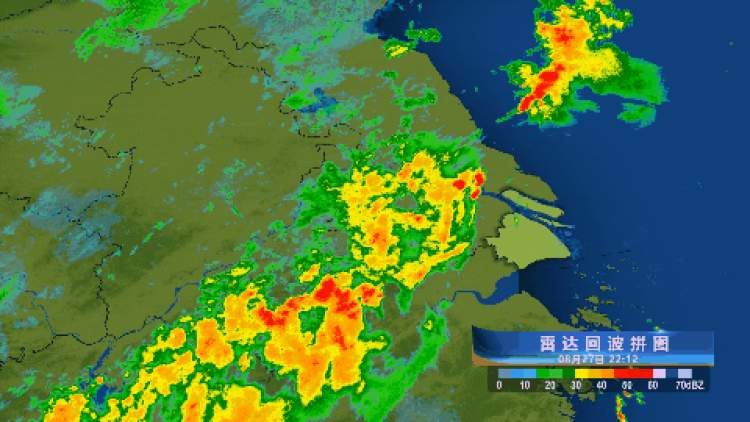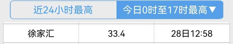 受高空槽影响,中午起本市大部出现阵雨或雷雨,12时至15时累积雨量松江新浜镇46.5毫米为最大。最终,全天最高气温停留在33.4℃。