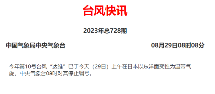 另据中央气象台消息,今年第10号台风“达维”已于今天上午在日本以东洋面变性为温带气旋,中央气象台今晨8时对其停止编号。