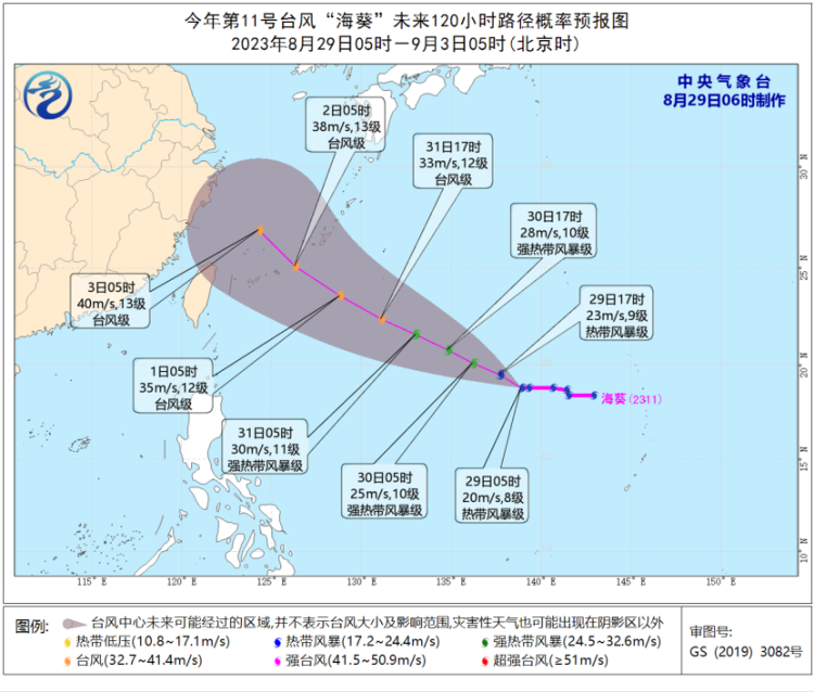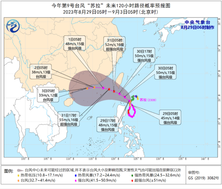 大风预报:8月29日08时至30日08时,巴士海峡、台湾以东洋面偏南海域将有6-8级、阵风9-10级的大风,其中巴士海峡偏东海域风力可达9-10级、阵风11-12级。