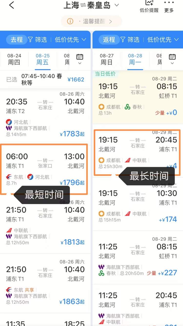 周女士搜索了9月中旬普通日期的上海到秦皇岛的航班,不仅一天有好几班,而且直达的情况下,全程只要2小时25分钟。