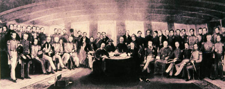 当年,因为林则徐禁烟沉重打击了英国鸦片商人的利益,英国发动鸦片战争,用武力打开中国的大门。1842年,英国侵略军先后攻占吴淞、上海、镇江之后,将军舰开到了南京江面,并把炮口对准南京城。腐败的清政府公开违背广大人民坚决抗敌的愿望,向侵略者屈膝投降。道光皇帝派遣的钦差大臣没有经过一次正式谈判,就全部接受了侵略者提出的“议和条件”。1842年8月29日,在英国“汉华丽”号军舰上签订了中国近代史上第一个不平等条约。