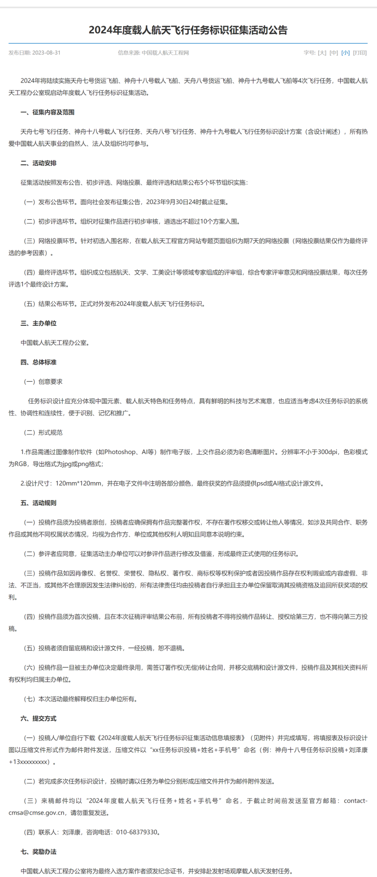 《2024年度载人航天飞行任务标识征集活动公告》全文见下方 ↓
