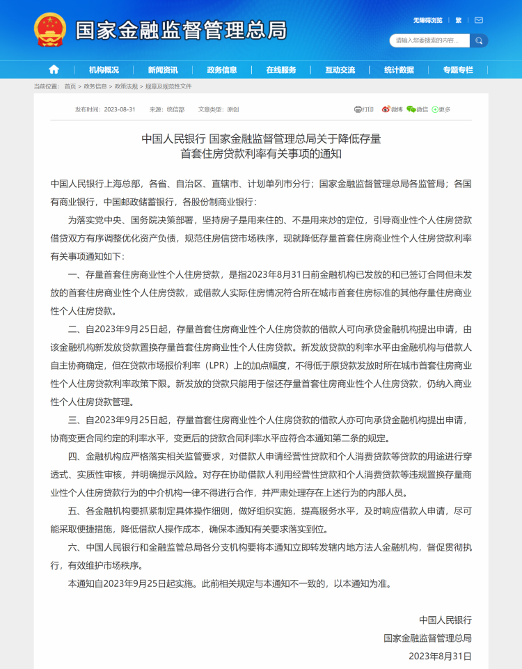 据国家金融监督管理总局网站8月31日消息,中国人民银行、国家金融监督管理总局联合下发《关于降低存量首套住房贷款利率有关事项的通知》。详见↓