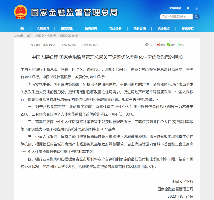 据国家金融监督管理总局网站8月31日消息,中国人民银行、国家金融监督管理总局联合下发《关于调整优化差别化住房信贷政策的通知》。