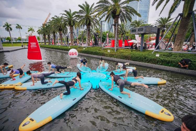 活动当天,“热汗竞技场”区域还进行了互动训练、百人拔河等热力环节;在“热汗营地”,匹克球、飞盘、腰旗、陆冲、流动棒铃、桨板瑜伽等趣味运动,吸引了众多社区伙伴参与;在“乐能补给岛”,lululemon特设“夏日轻装屋”,客人可体验并选购喜爱的夏日经典训练装备。
