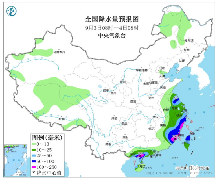 9月3日08时至4日08时,广东西南部、广西东南部、福建、浙江中东部、江苏中部、台湾岛中北部等地有大到暴雨,其中,广东西南部、广西东南部、福建东部、浙江东南部等地部分地区有大暴雨(100~200毫米)。江南东部沿海有6~8级风(见图7)。大风预报信息请参见中央气象台最新一期《海洋天气公报》。